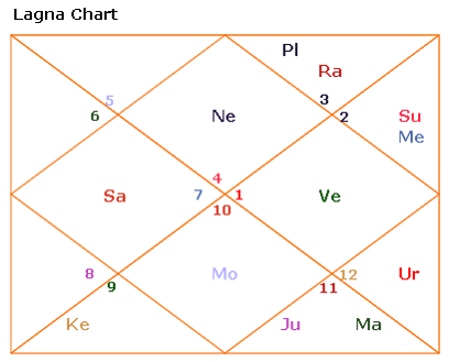 On the other hand Cancer ascendant is ruled by strong emotions, which is clearly visible, such that her personal life was not prosperous but very clearly it caught public attention. Saturn the lord of the 7th house of partnership and marriage and being posited in the 4th house of stability in its exalted sign of Venus, gave her a lot of public attention and materialistic assets and wealth but deprived her of marital bliss. This is due to the reason that the 7th house lord Saturn was aspected by the 12th house placement Rahu. Venus, the significator of love and marriage was also afflicted by Saturn and Rahu which gave problems in the married life and led to divorce in the year 1946.