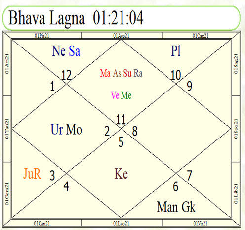 Chalit stands for the movement. In the following chart, the Rashi chart rising Ascendant is Capricorn, and in the Bhava Chalit Chart, it's Aquarius Ascendant.